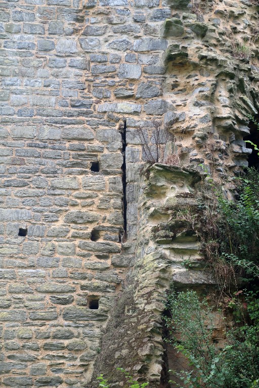 Vue de détail de la tour nord-est après restauration depuis le nord-ouest. La courtine file vers le nord-ouest : elle est flanquée par une archèreImmatriculation