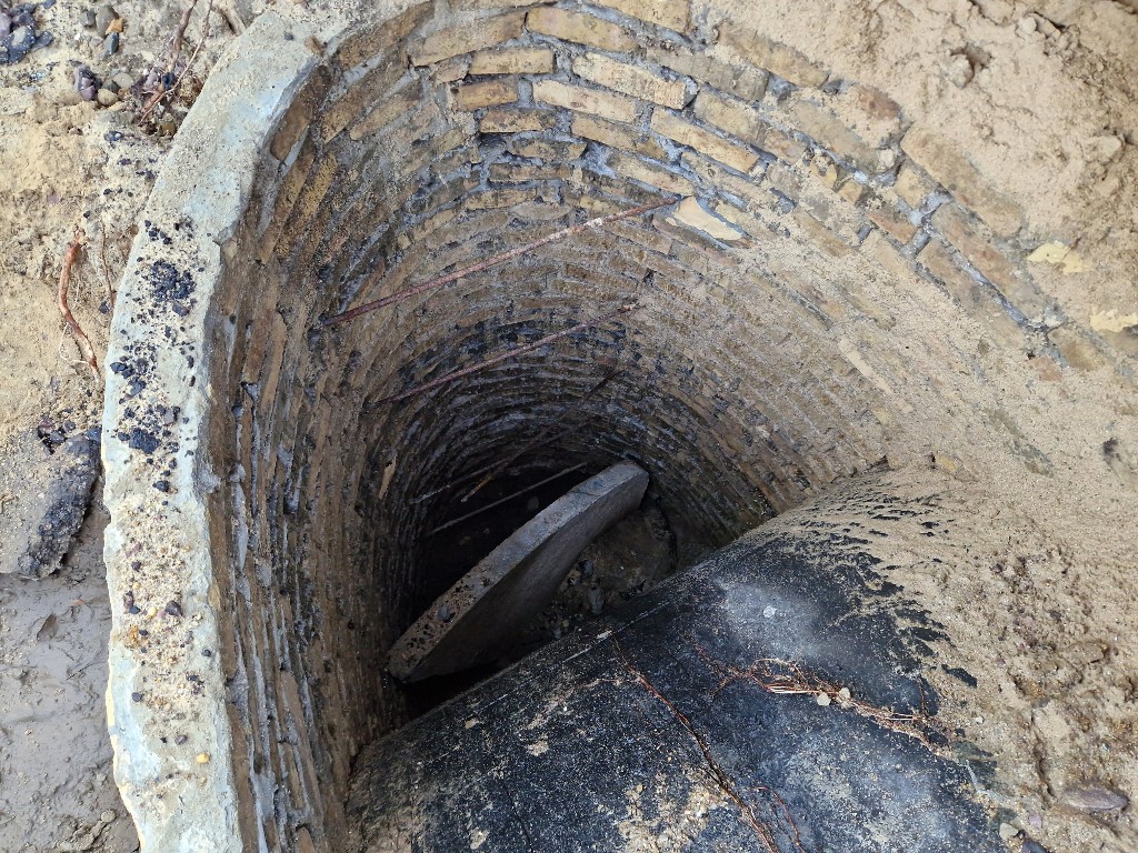Vue du puits de la sortie de secours. Le puits est en maçonnerie de brique montée au ciment avec échelon en fer à béton ; il est partiellement obstruéImmatriculation