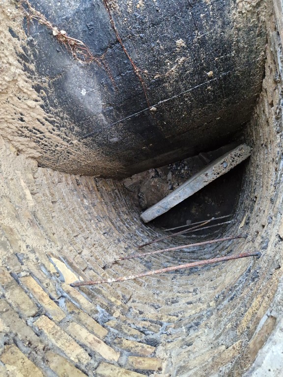 Vue zénithale du puits de la sortie de secours. Le puits est en maçonnerie de brique montée au ciment avec échelon en fer à béton ; il est partiellement obstruéImmatriculation
