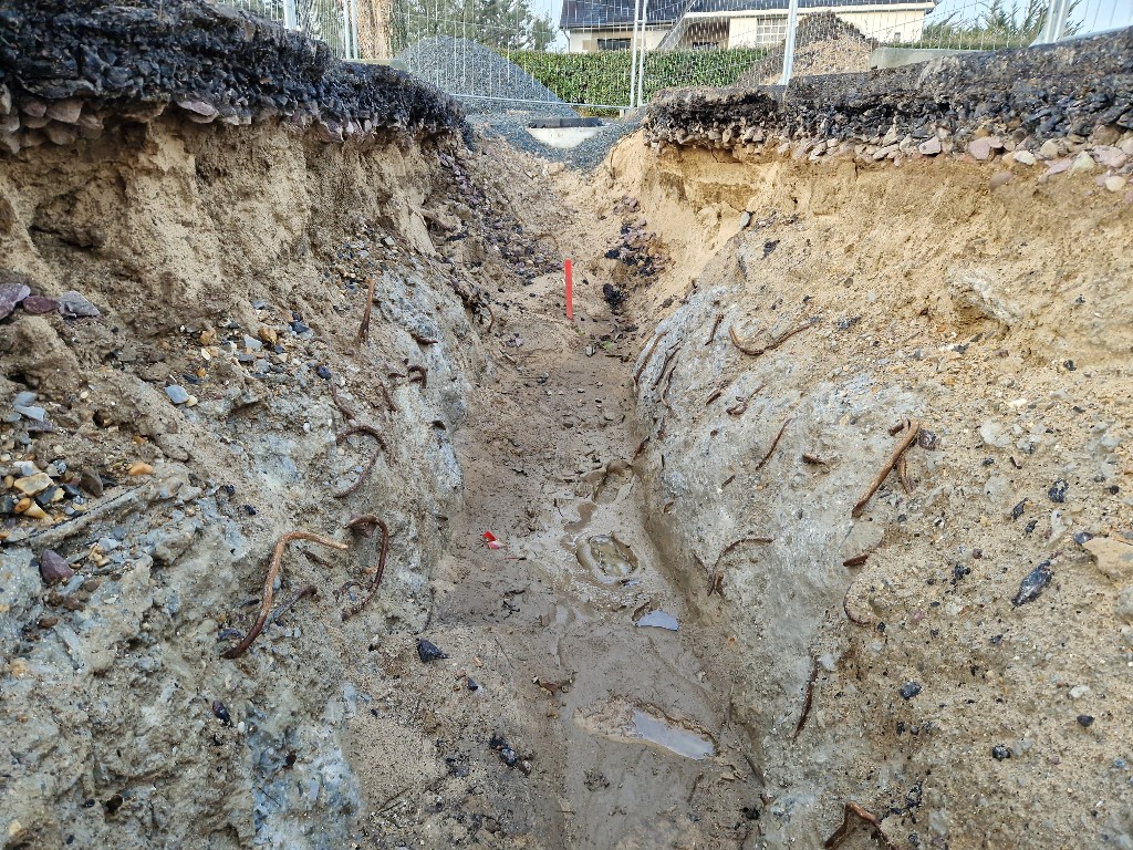 Vue de détail de la dalle de couverture : tranchée aménagée dans le béton armé pour le passage d'un tuyau d'assainissement. Les fers à béton mesurent 20 mm de diamètreImmatriculation
