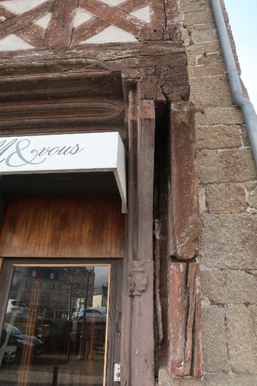 Le décor sculpté sur l'encorbellement se poursuit en partie gauche du poteau cornier du rez-de-chaussée.Immatriculation