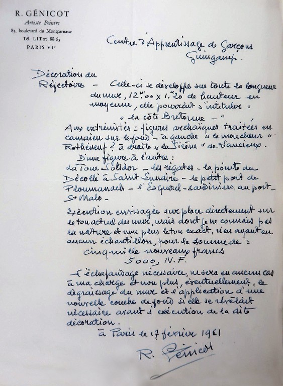 Description de la décoration du réfectoire (disparue) par l'artiste Robert Génicot, 17 février 1961Immatriculation