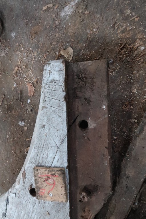 Marque de charpentier tracé à la reinette sur un élément en bois déposé après l'incendie en 2019 de la maison de Saint-Dinan.Immatriculation
