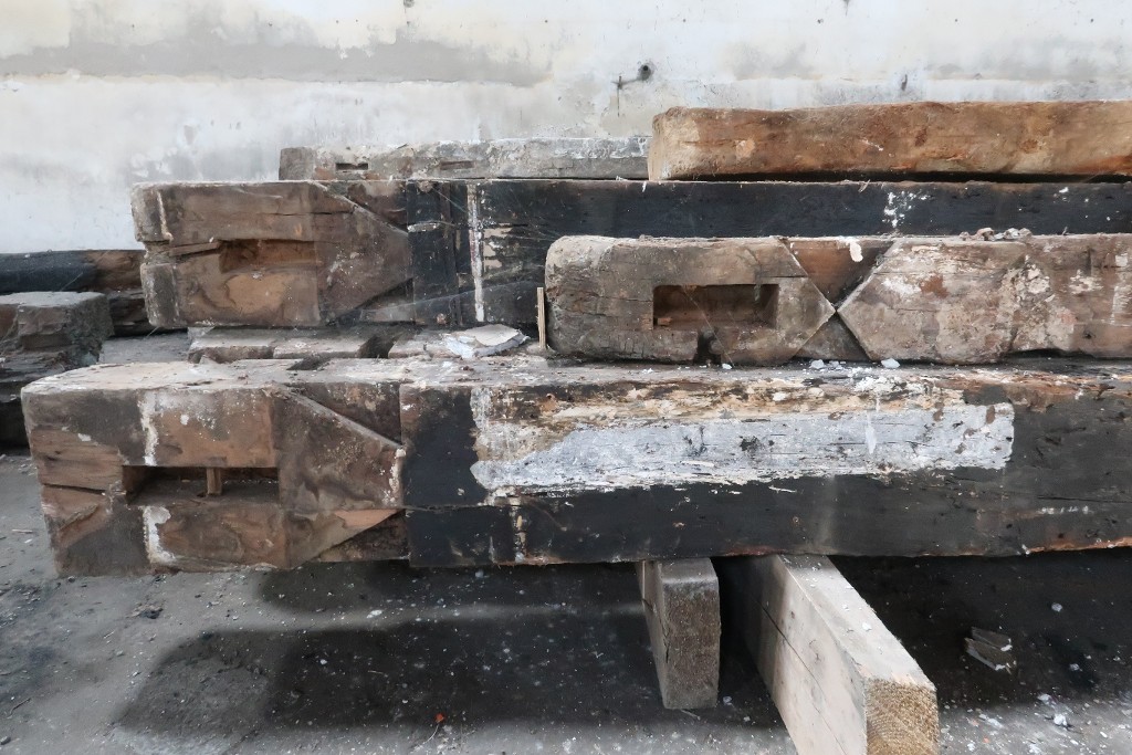 Assemblages en queue d'aronde et tenon-mortaise visibles en sous-face de solives déposées après l'incendie en 2019 de la Maison de Saint-Dinan et de ses extensions.Immatriculation
