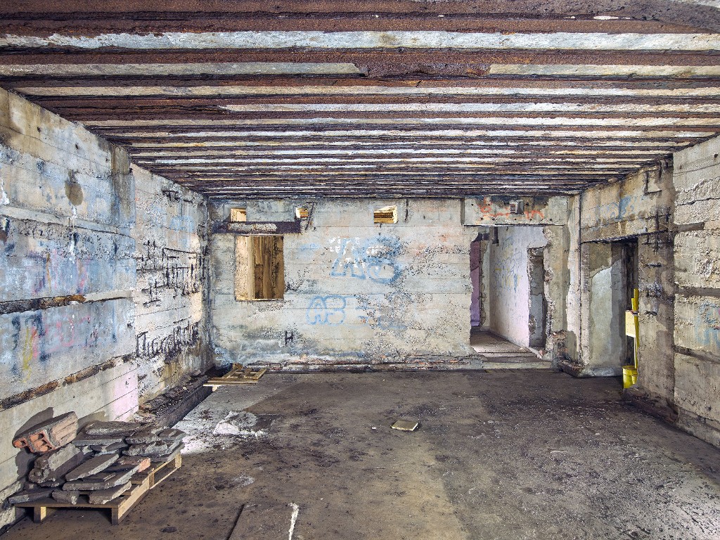 Vue du bunker - abri de type 485 long pour radar Mammut : salle d'exploitation. Au fond : à gauche, ouverture donnant sur la salle des ventilateurs ; à droite, vers le sas étanche ; encore à droite, vers la salle du groupe électrogène de secoursImmatriculation