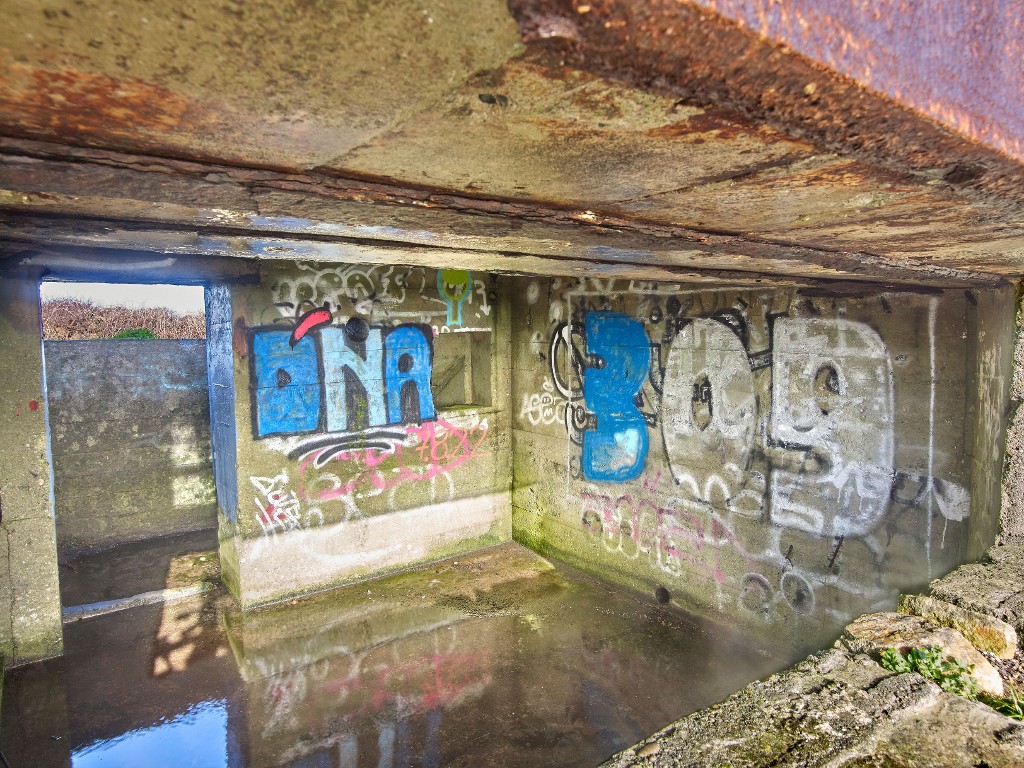 Vue du bunker - casemate, variante d'un type 667 : chambre de combat photographiée depuis l'embrasure. A gauche, l'entrée. Cette casemate était armée par un canon de 5 cm tirant vers le chemin d'accès au sud-estImmatriculation