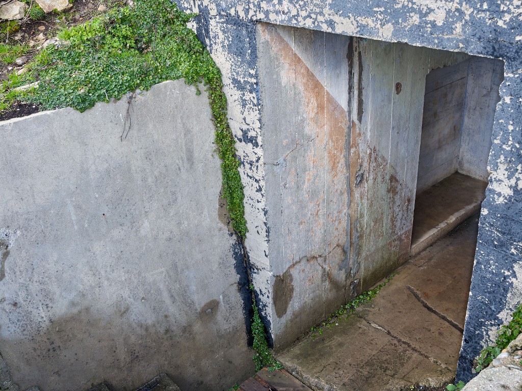 Vue du bunker - abri de type VF 1b pour 6 hommes : entrée sud-ouest précédée d'un escalier. De part et d'autre du passage d'entrée, peinture murale à usage de camouflage (teinte ocre)Immatriculation