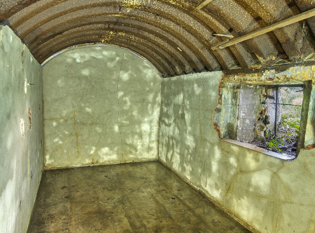 Vue du bunker - abri de type VF 1b pour 6 hommes : salle de garde (couverte en tôle ondulée cintrée dite tôle métro). A droite, la sortie de secours. Le bunker a ultérieurement été transformé en logementImmatriculation