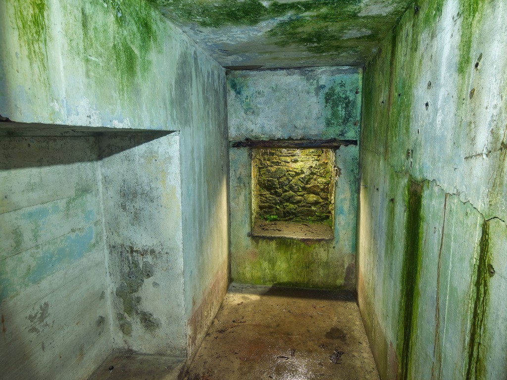 Vue du bunker - abri de type VF 1b pour 6 hommes : couloir d'accès orienté vers le nord-est. A gauche, niches murales. Orientée vers le nord-est, la seconde entrée a été transformée en cheminéeImmatriculation