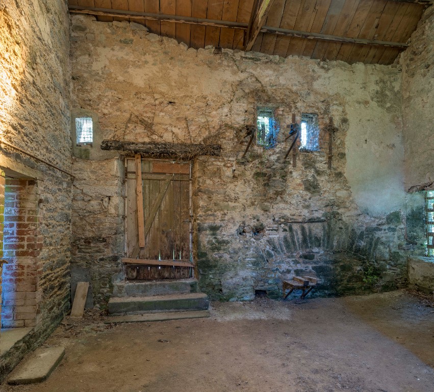 Bâtiment principal. Salle 1. Mur arrière sud-est avec traces d'ouverture du moulin à papierImmatriculation