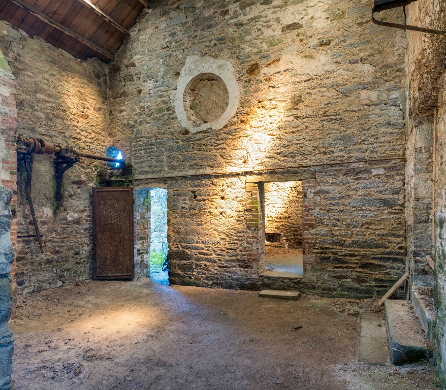 Bâtiment principal. Salle 1. Mur de refend avec porte d'entrée, porte donnant dans la salle 2 et ouverture pour l'axe de transmissionImmatriculation