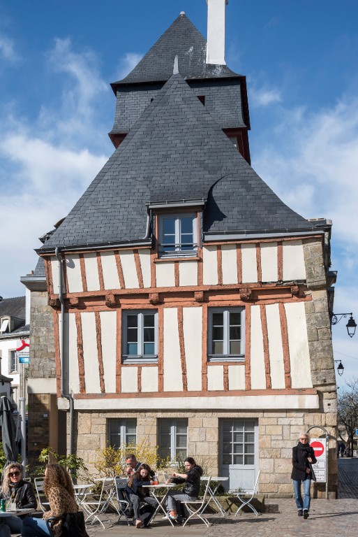 La façade en pan de bois donnant sur la place et accompagnée d'un mur à ressauts qui penche.Immatriculation