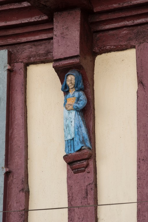 Femme en coiffe, robe et tablier, les mains jointes devant son ventre.Immatriculation