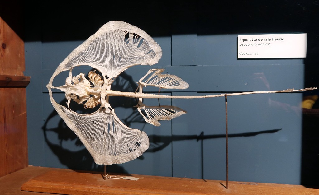 Squelette de raie fleurie sous vitrine au MarinariumImmatriculation