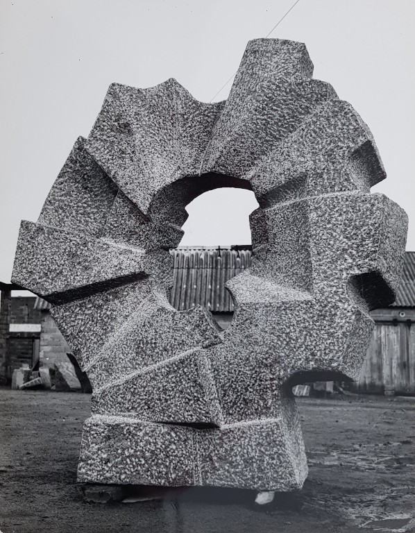 "Soleil", sculpture en granite rose de Simone Boisecq. Vue prise en 1977, avant installation.Immatriculation