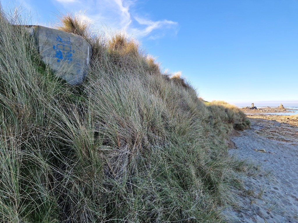 Vue générale depuis la plage. Envahi par le sable, le bunker subit l'érosion marine et le mouvement des dunesImmatriculation