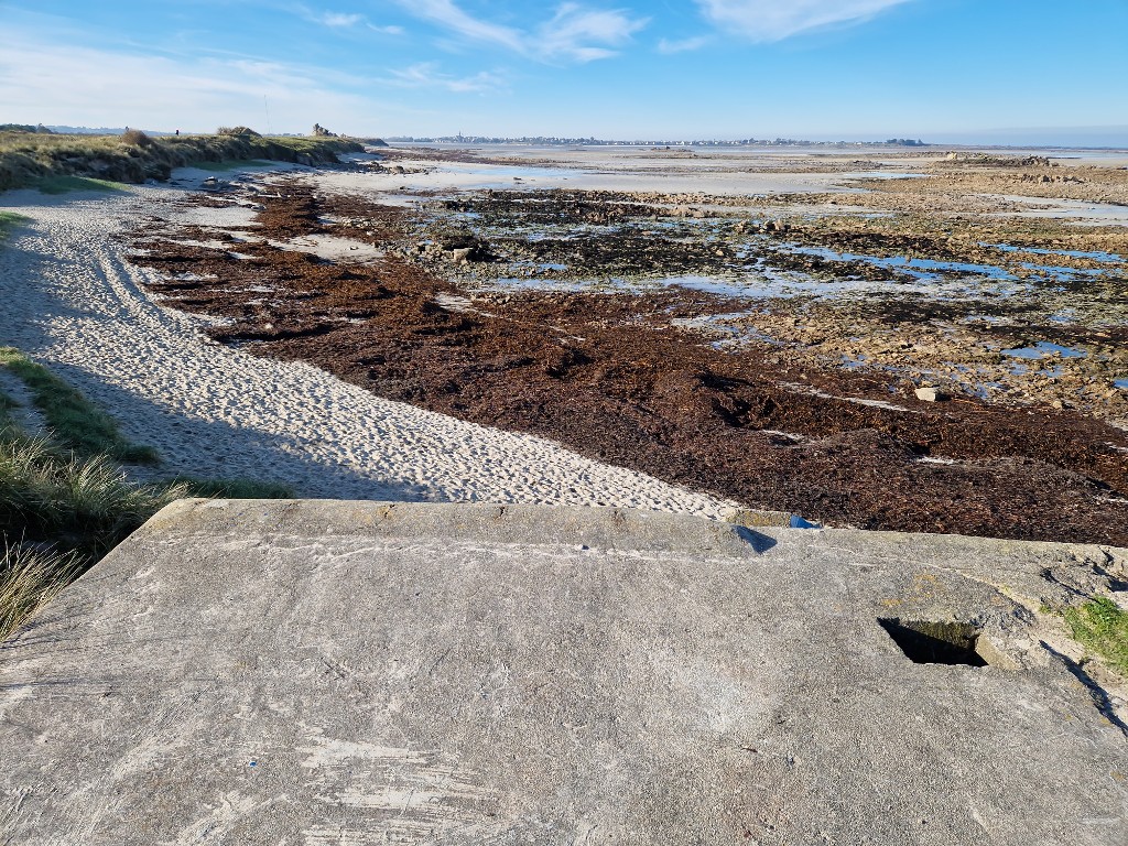 Vue du champ de tir vers l'ouest depuis la dalle de couverture. En arrière-plan, la grève de Goulven à marée basseImmatriculation