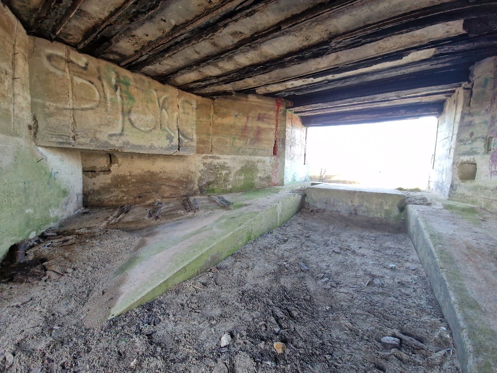 Vue intérieure : chambre de combat depuis l'entrée est. Rampes inclinées et rainures permettaient de faire monter puis de caler les roues de l'affût du canonImmatriculation