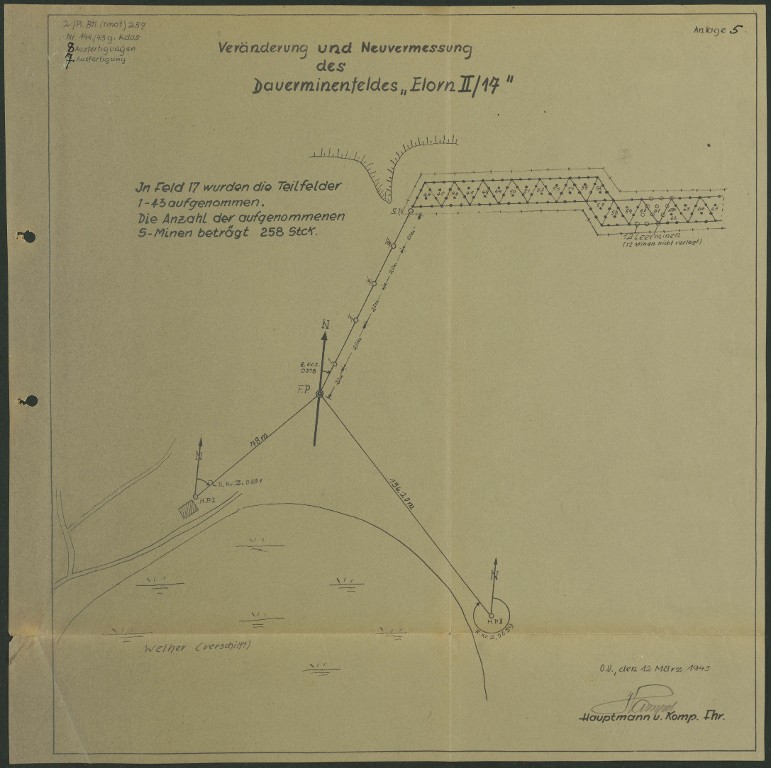 Dossier allemand de minage, commune de Tréflez, champ de mines Elorn II/17 : modification et réexamen du champ de mines permanent, 12 mars 1943 [1538 engins de type S. Minen + 258 engins]-