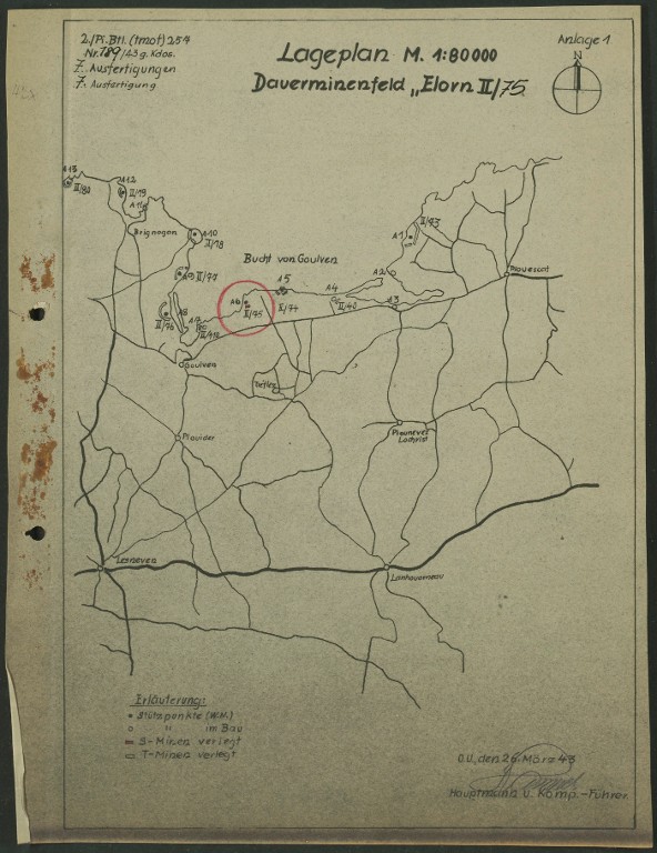 Dossier allemand de minage, commune de Tréflez, champ de mines permanent Elorn II/75 : plan de situation, 26 mars 1943Immatriculation