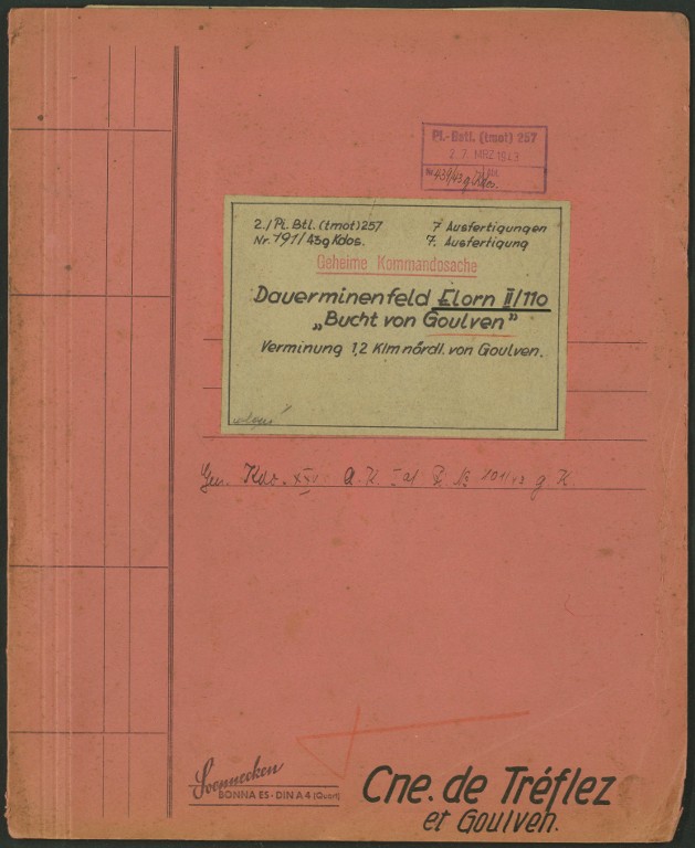 Dossier allemand de minage, commune de Tréflez, champ de mines permanent Elorn II/110 : pochette, 27 mars 1943Immatriculation
