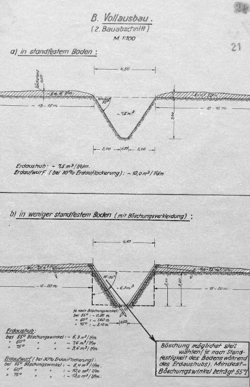 Profil d'obstacle antichar - fossé : B. expansion complète a) dans un sol stable b) dans des conditions moins stables (avec revêtement de remblai) (source : Bundesarchiv, RH_11_III_130_0050)Immatriculation