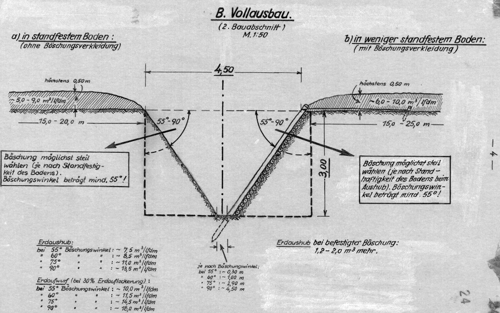 Profil d'obstacle antichar - fossé : B. expansion complète a) dans un sol stable b) dans des conditions moins stables (avec revêtement de remblai) (source : Bundesarchiv, RH_11_III_130_0054)Immatriculation