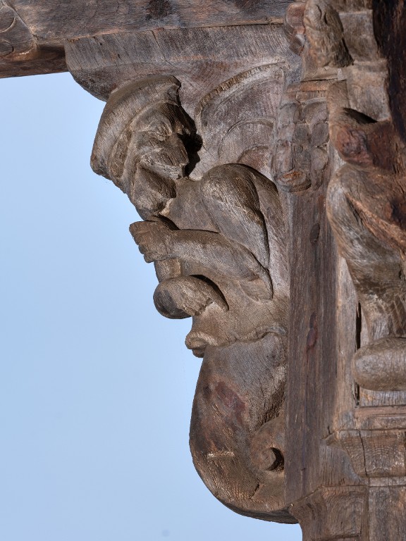 Personnage grimaçant sculpté sur une console.Immatriculation