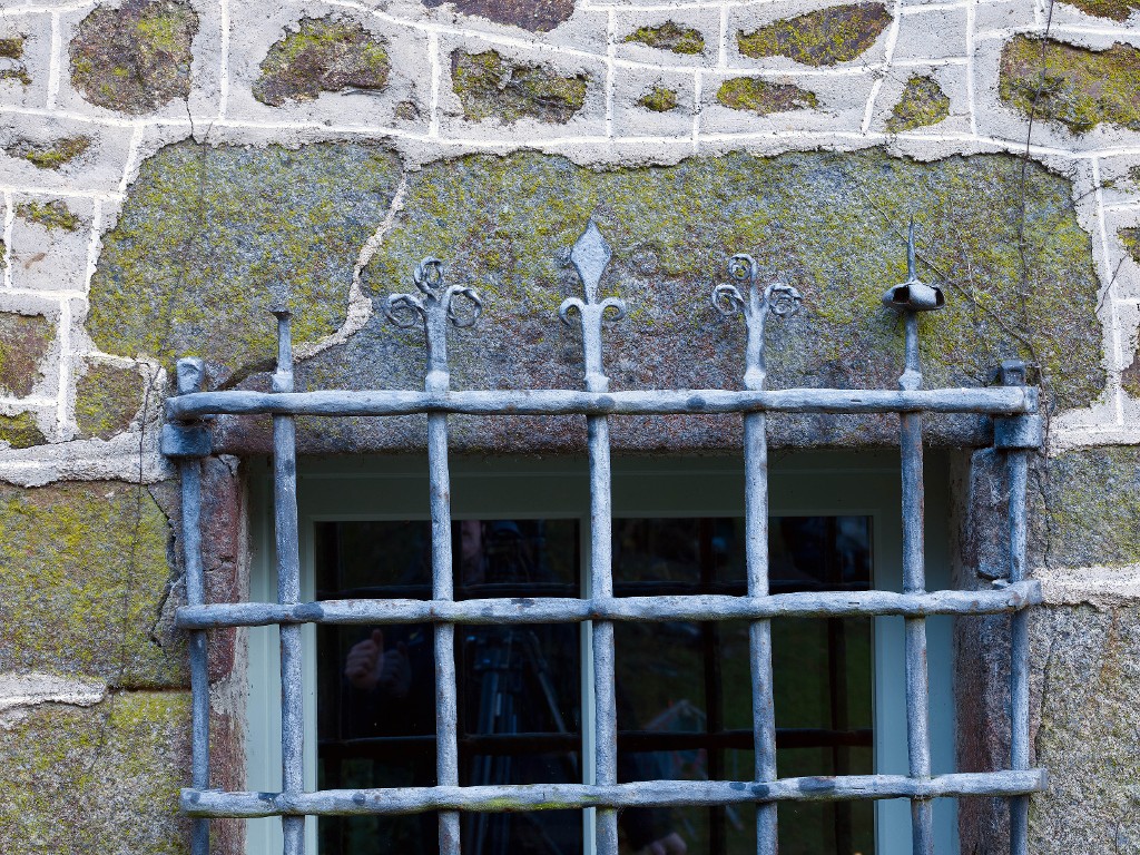 Façade sud. Fenêtre de la salle est. Détail de la grille en fer forgé ornée d'une fleur de lys, de rinceaux en volutes et d'une sorte de toupieImmatriculation