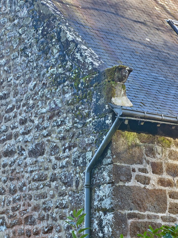 Pignon découvert ouest. Détail de la pierre d'assise du rampant, ornée d'une têteImmatriculation