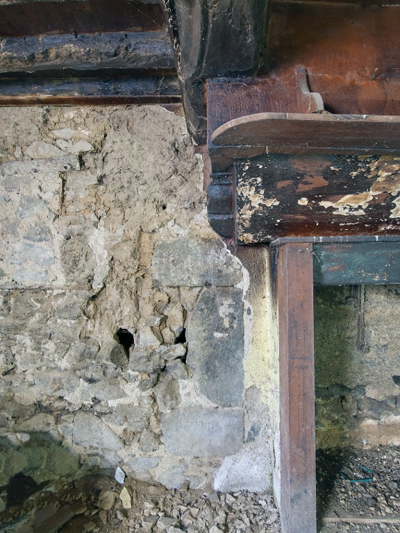 Logis sud. Pignon sud. Cheminée ancienne en pierre derrière l'habillage moderne en boisImmatriculation