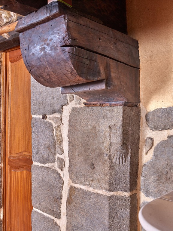 Salle. Cheminée. Console en bois et jambage en granite orné dans sa partie supérieure d'une tête barbueImmatriculation
