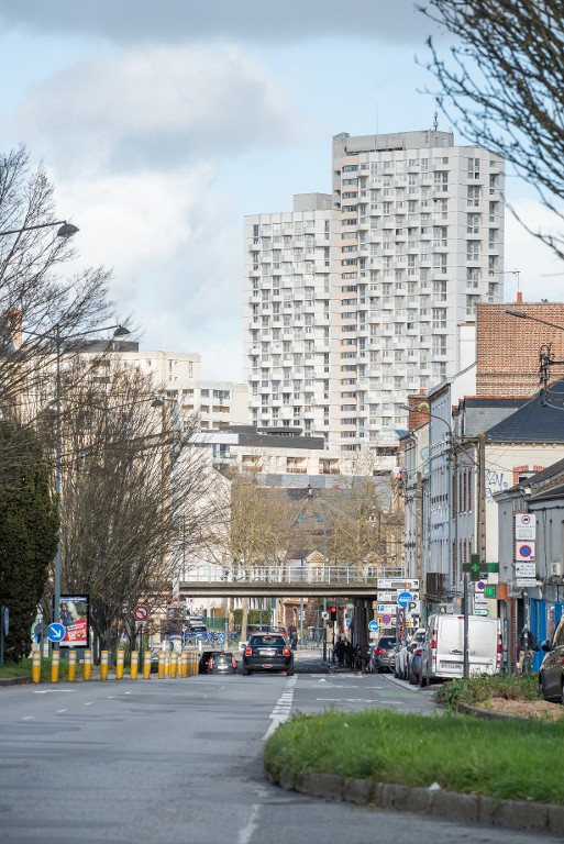Vue de la rue de Nantes vers le nord. En arrière-plan, l'immeuble de grande hauteur dit l'Eperon.Immatriculation