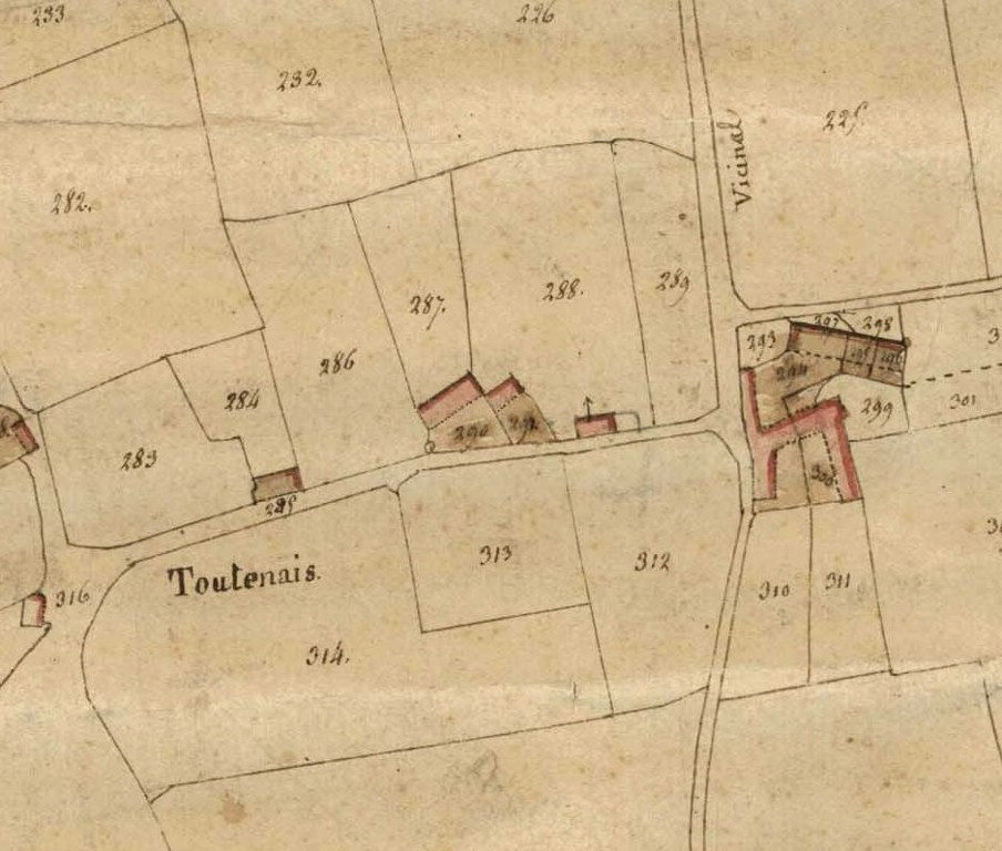 Toutenais en 1825. Extrait du cadastre ancien, 1ère feuille (Archives départementales d'Ille-et-Vilaine, série 3 P)Immatriculation