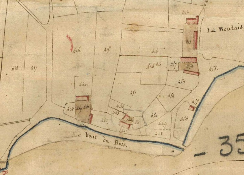 Le Bout du Bois en 1825. Extrait du cadastre ancien, 2e feuille (Archives départementales d'Ille-et-Vilaine, série 3 P)Immatriculation