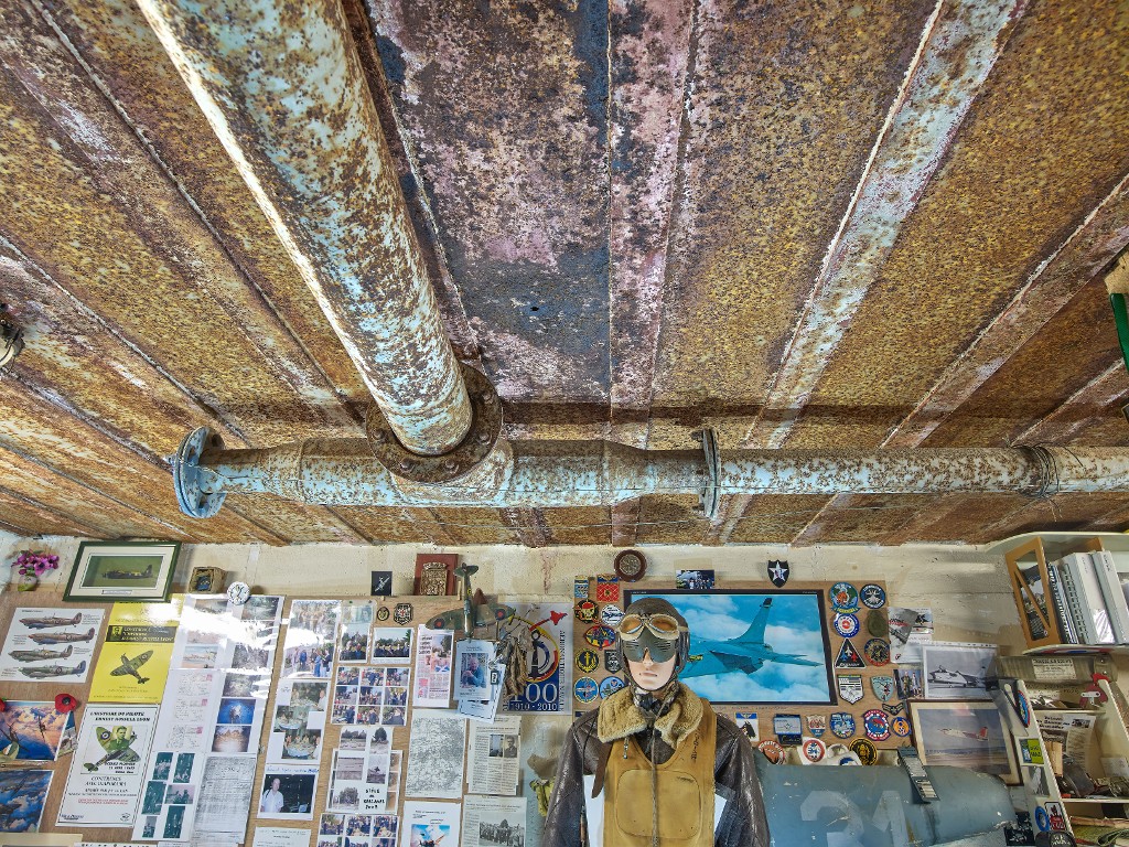 Vue intérieure : tuyauterie d'origine du système de ventilation et de filtration (la couleur bleu est d'origine). Dans ce bunker-musée, la thématique est l'aéronautiqueImmatriculation