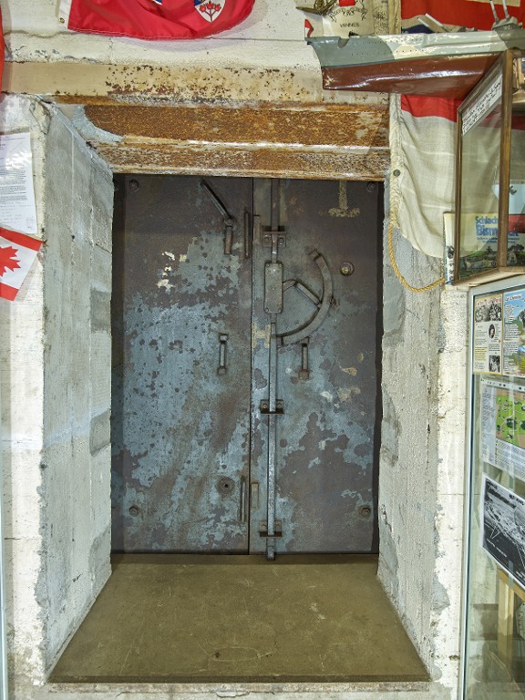Vue intérieure : sas, porte blindée de type B8 à deux battants (en position fermée) de la salle des machines pour deux groupes électrogènes. Ce bunker-musée a pour thématique la Seconde Guerre mondiale et la batterie d'artillerie antiaérienne RossittenImmatriculation