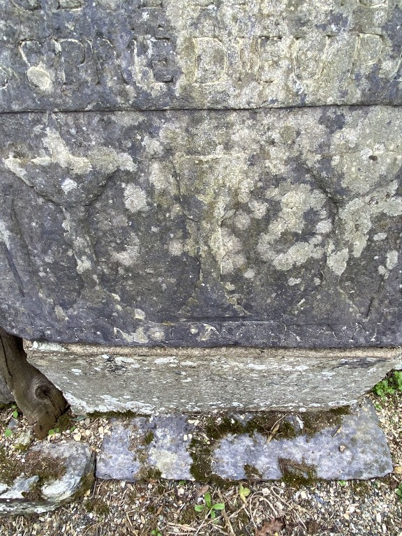 Aux pieds de la tombe du prêtre Jean Houeix, un calice et deux chandeliers (?).Immatriculation