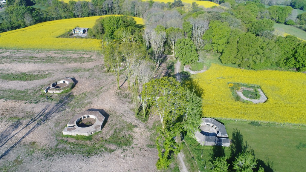Vue générale oblique depuis l'est des six bunkers-cuves de type Fl243a pour canon antiaérien de 10.5 cm et des deux bunkers-postes de direction de tir pour télémètreImmatriculation