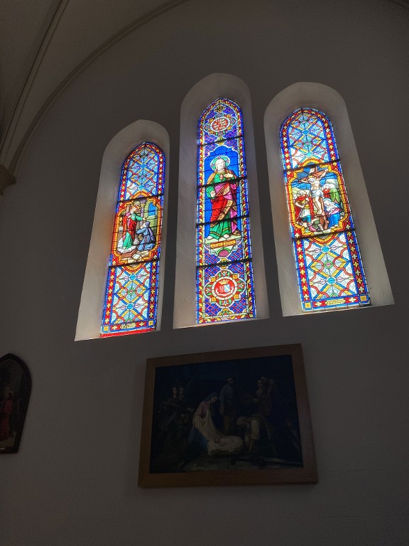 Ensemble de 7 verrières à personnages des baies 0 à 6 : Éducation de la Vierge, Saint Joseph, Saint Fiacre, Donation du Rosaire, Immaculée Conception, apparition de lourdes, Sacré-Cœur et Sainte Marguerite-Marie Alacoque, Sacré-Cœur, Crucifixion, église Sainte-Zéphirine (Tréal),