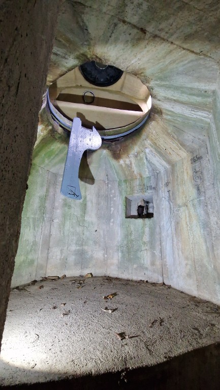 Vue intérieure du poste d'observation. Sur le mur est peint un panorama de tir. Dans la petite niche murale, se trouve un tuyau acoustique relié à la salle de garde. Une planchette pour mitrailleuse est reconstituéeImmatriculation