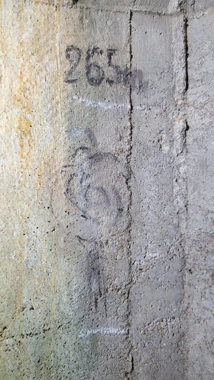 Vue intérieure du poste d'observation. Sur le mur est peint un panorama de tir : l'arbre servant de point de repère se trouve à 265 m de distanceImmatriculation