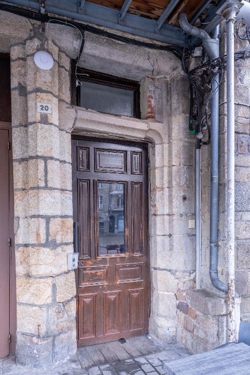 Porte au linteau surbaissé et surmonté d'une imposte. Elle ouvre sur un couloir séparé de la partie boutique et aboutit à un escalier en vis.Immatriculation