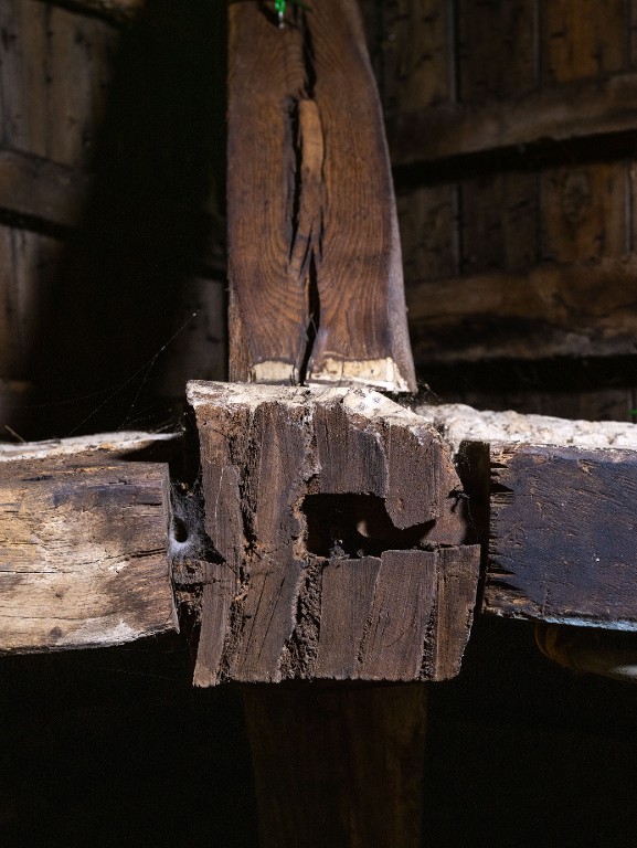 Traces de sciage du poinçon de la deuxième ferme depuis la rue. Assemblage à tenon-mortaise des jambettes arquées.Immatriculation