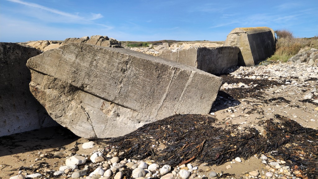 Vue de détail depuis le milieu de la grève. Des sections de mur sont couchées sur la grève du côté de la merImmatriculation