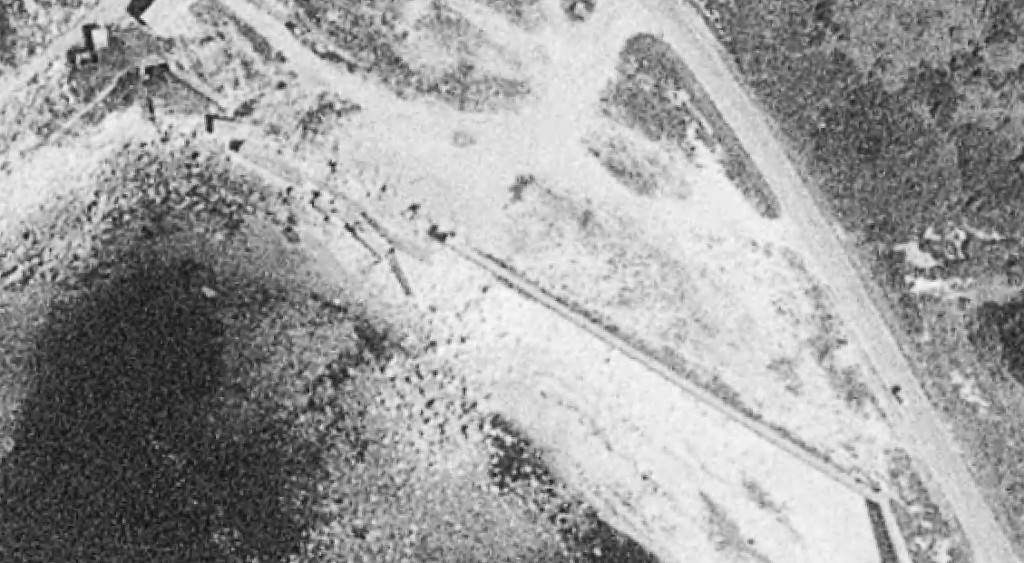Vue aérienne verticale, 1971 : détail de la partie nord avec le bunker-casemate de type 505 pour canon antichar qui prenait en enfilade la grèveImmatriculation