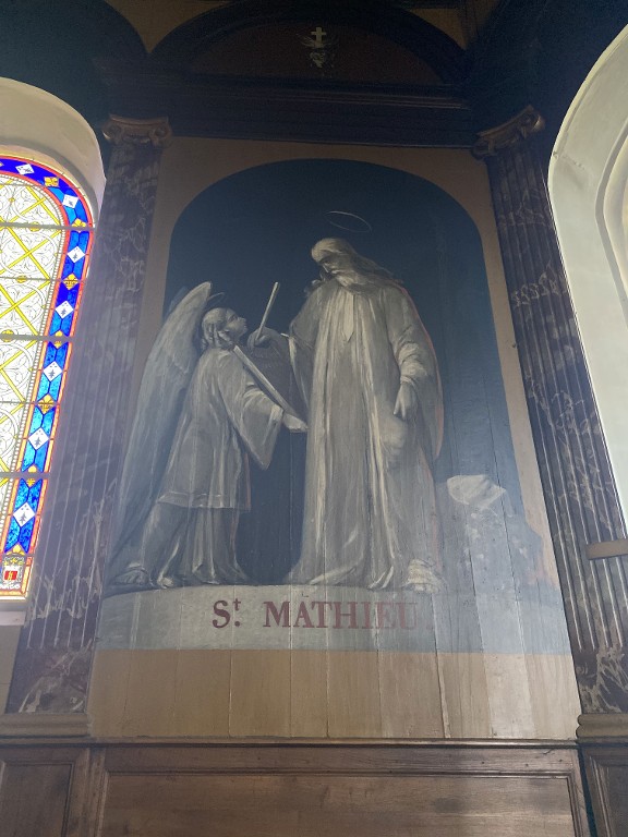 Lambris de hauteur, peinture : les christ en croix, évangélistes, église paroissiale Sainte-Croix (La Croix-Helléan),