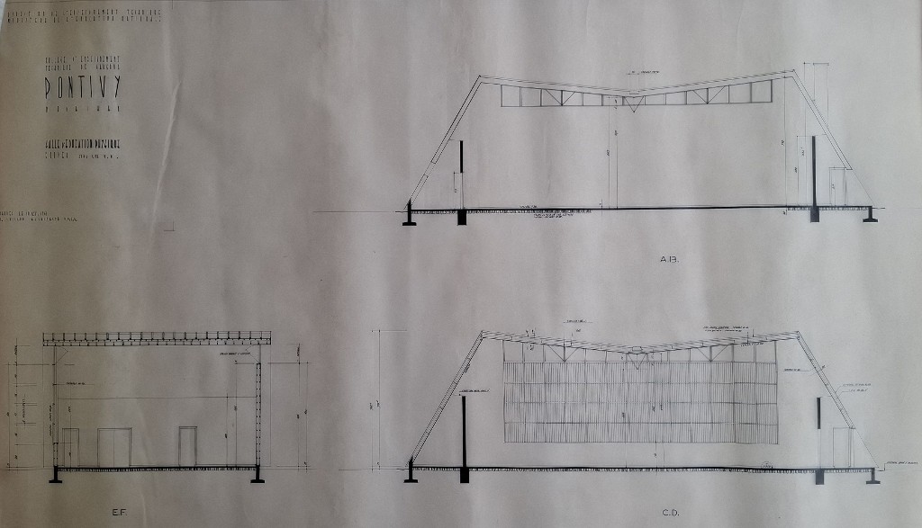 Archives départementales du Morbihan : 110 J 58. Guillou [Yves], Plan, façades et coupes du gymnase, 1961