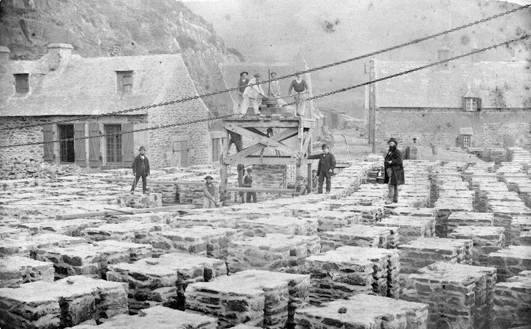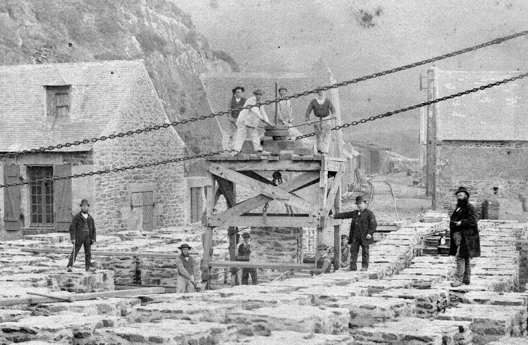 Vue du fort du Mengant en 1877 : détail des casernements et pièces d'artillerie (14 canons de 30 livres modèle 1840 sur affût pivotant et 14 obusiers de 22 cm modèle 1827 sur affût de fer pivotant)