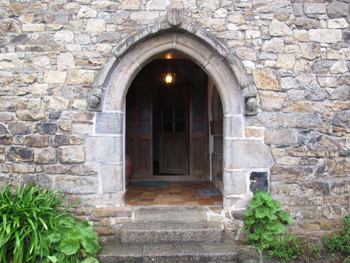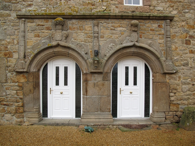 Plouaret, Kervégan Braz : manoir, élévation antérieure, porte en arc bisé surmontée d'armoiries